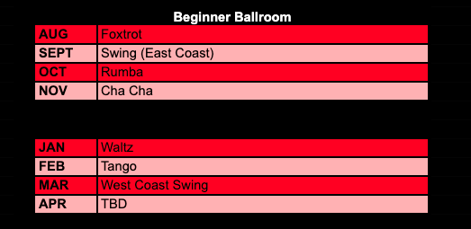 Are you new to ballroom dancing? We'd love to have you join us. No prior dance experience needed. The beginning of the month is the best time to drop in as we rotate styles each month. However, SUMMER SESSION is a sampler, so we move through a new dance every few weeks. Email natalie@dancefx.org if you have questions about the best time to start.